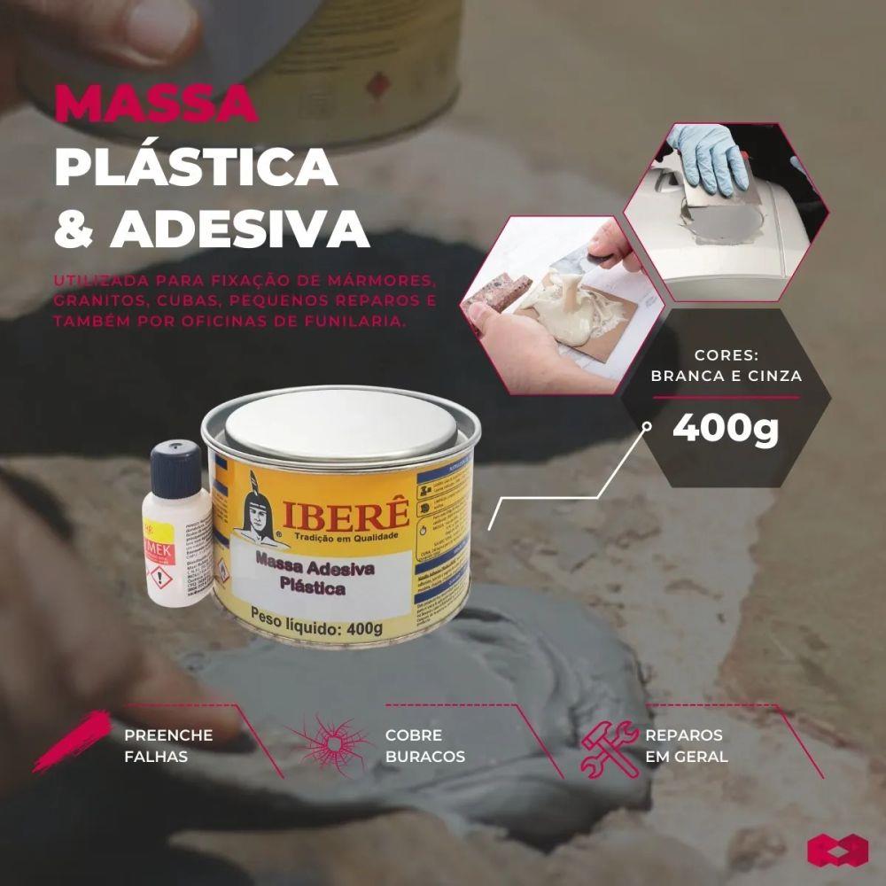 Massa Adesiva Plástica Branca Ibere 4000g A massa adesiva plástica cinza, desenvolvido pela Ibere é indicada para a construção civil: adesão, junção e colagem de cubas, granitos, mármores, calhas e móveis, funilarias, chaparias em geral e modelagem.