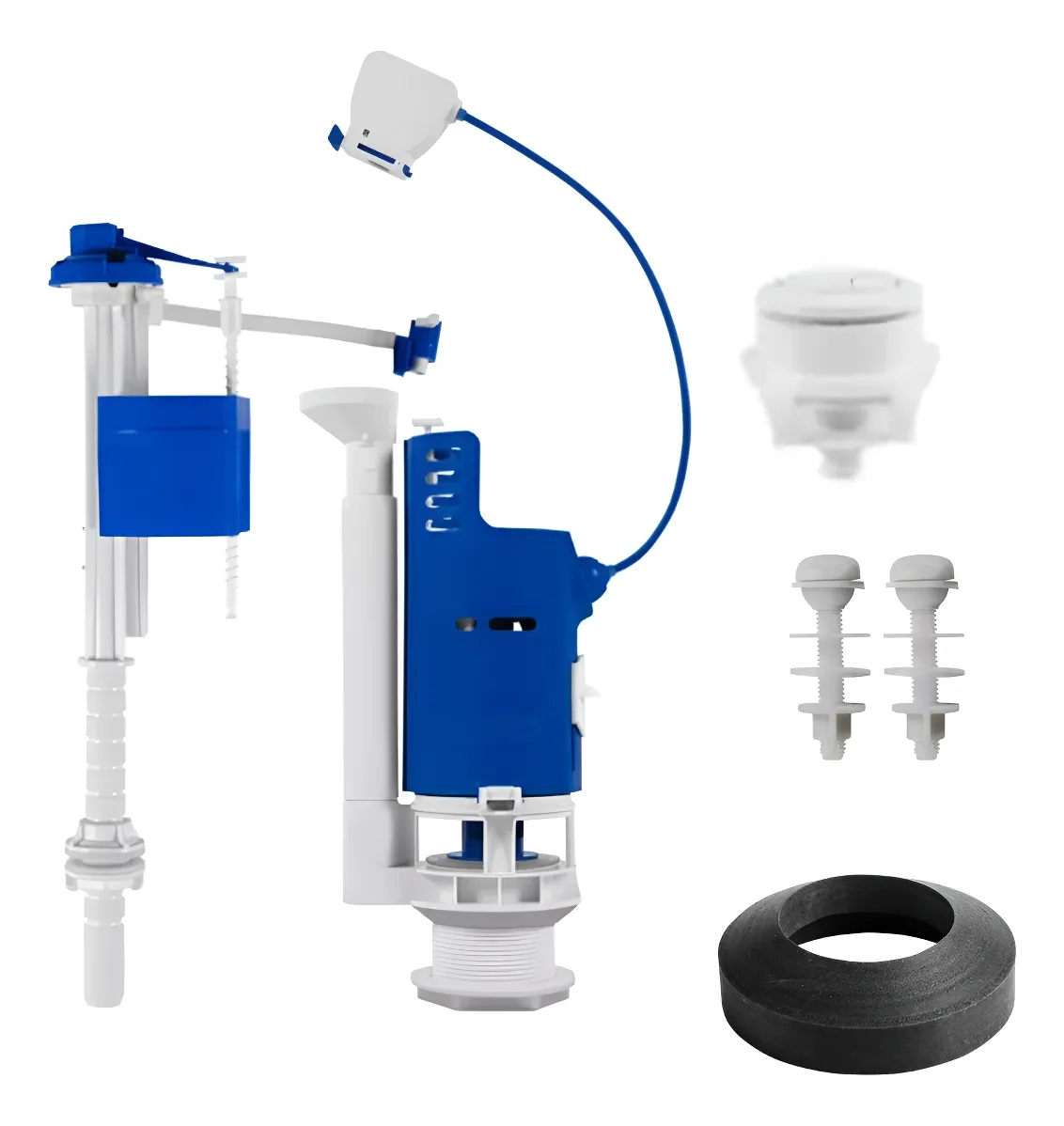 Mecanismo de entrada universal com alimentação submersa + Mecanismo de saída universal duplo fluxo por cabo + Botão de acionamento vertical duplo fluxo cromado + Anel bolsa de Vedação universal + Conjunto de parafusos universais de fixação para caixa acoplada.