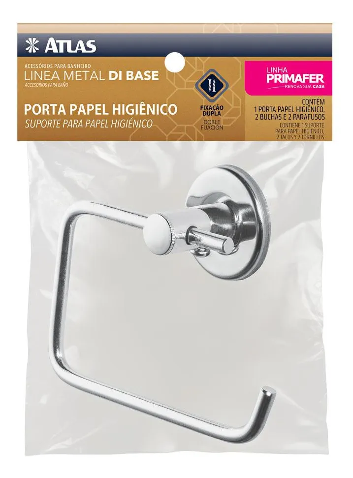 PORTA PAPEL HIGIÊNICO DE METAL POLIDO LINHA DI BASE ATLAS Acessório fixo metálico Di Base. Resistente, com peças metálicas com acabamento em alumínio polido. Design moderno, combina perfeitamente com os metais do banheiro. Indicação de uso: Design moderno e acabamento em alumínio polido, combina perfeitamente com qualquer banheiro. Não deve-se usar produtos abrasivos na limpeza, sendo indicado apenas pano e sabão neutro.